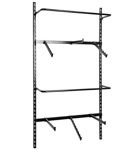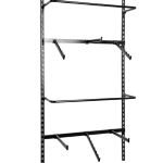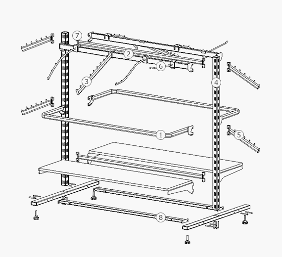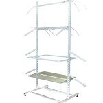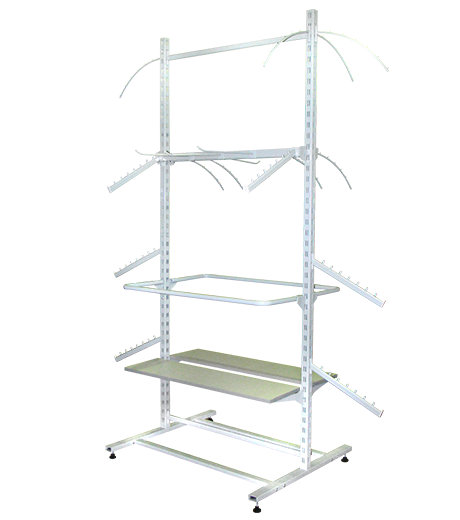Стелажі для одягу комплектуються різними гачками, вішаками, штангами, полками та іншими незамінними пристосуваннями. Правильне поєднання цих елементів дозволяє не тільки мінімізувати використовувану площу приміщення, а й максимально показати товар з усіх боків.